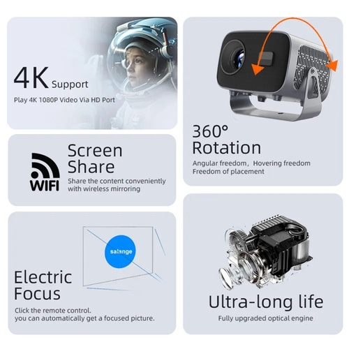 4000 لومن ANSI (تبلیغ شده به عنوان 6000 لومن) بر روی صفحه نمایش تا 200 اینچ، حتی در محیط های با نور متوسط، پخش می شود.تصاویر پخش شده توسط دستگاه کاملا واضح بوده و رنگ ها به صورت طبیعی و درخشان دیده می شوند. این پروژکتور دارای سیستم عامل Android 11.0 است و بدون نیاز به سیستم لپ تاپ و یا کامپیوتر میتواند مستقیما به اینترنت وصل شود تا بتوانید به راحتی بیش از 4000 برنامه یا محتوای مورد نظر خود را دانلود کنید.با وضوح تصویر بالا به شما تصاویر واضح ارائه میکند. با طراحی زیبا و مدرن خود به شما تجربه سینمایی فوق العاده در خانه می دهد، فیلم تماشا کنید و از مهمانی ها لذت ببرید.